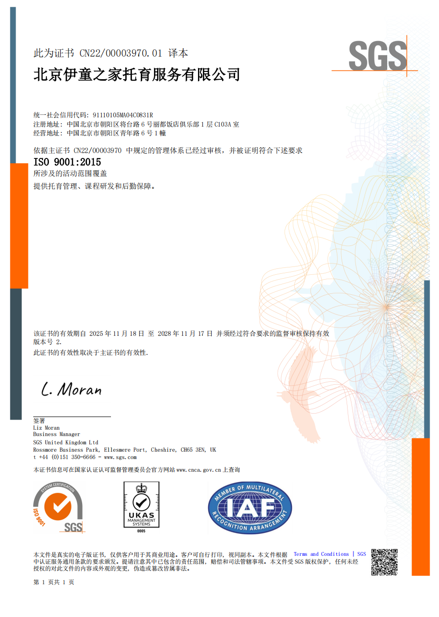 在本次认证审核过程中,SGS专家团队对伊童之家及旗下丽都托育中心的托育服务全流程、环境管理措施及实地运营情况进行了极其严格的审查,并分别与运营、教学、后勤、家长服务、人力、招生、采购等各部门进行了深入的一对一审核沟通,对伊童之家的管理体系和服务质量给予了高度评价。